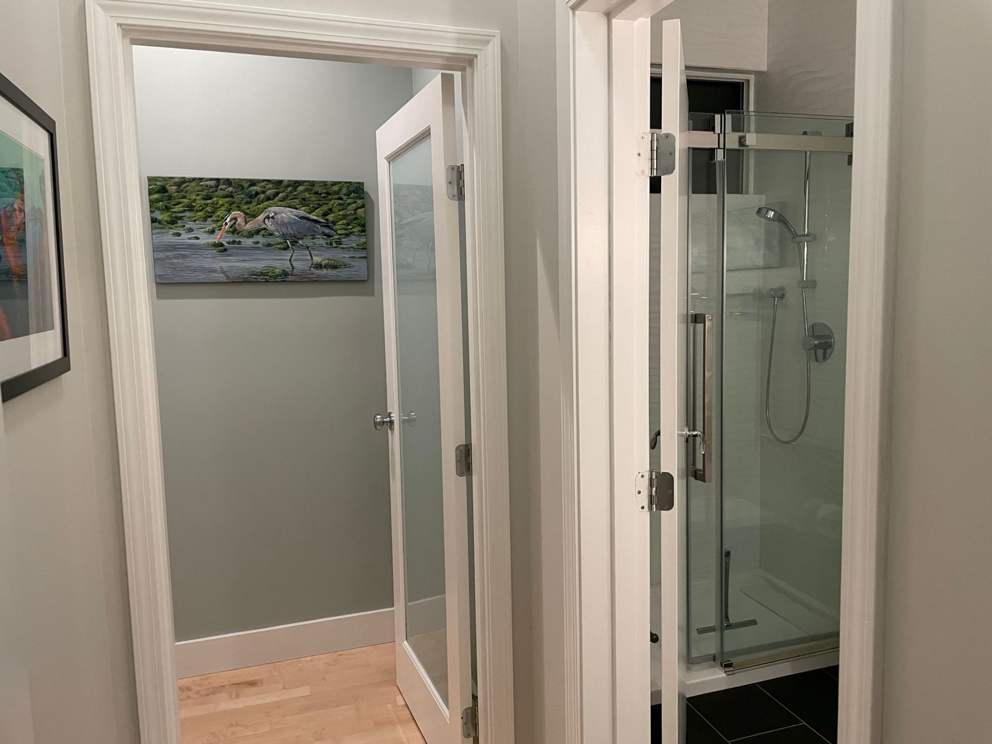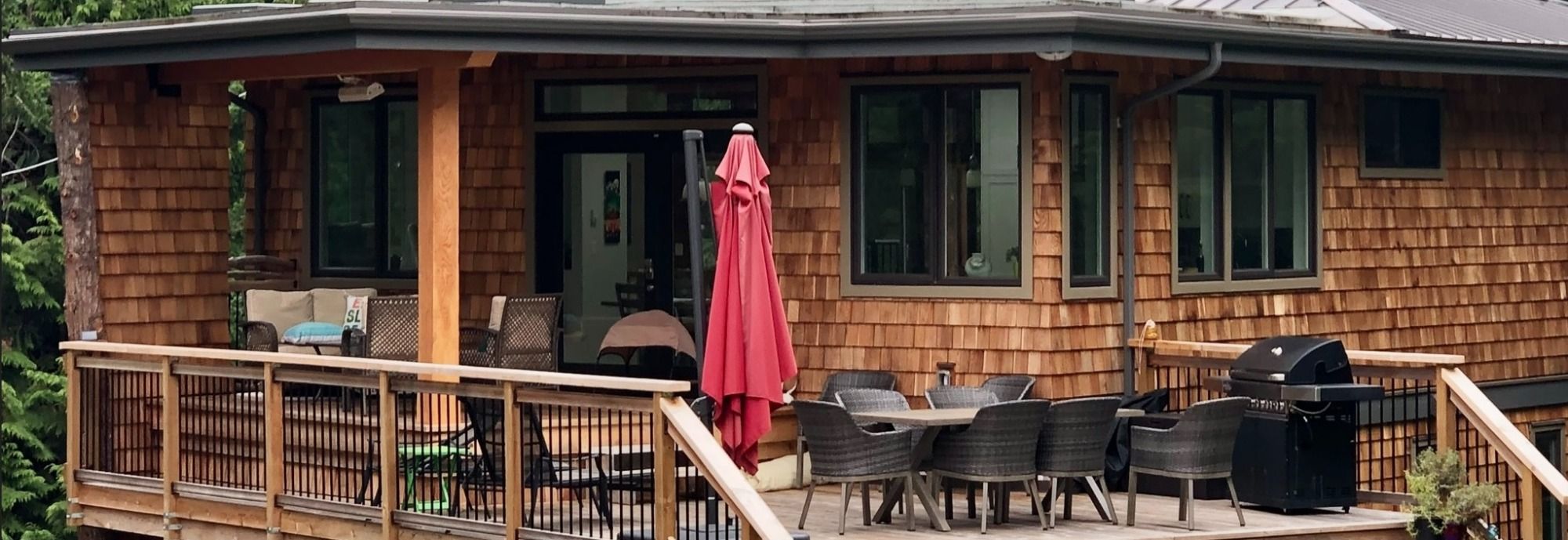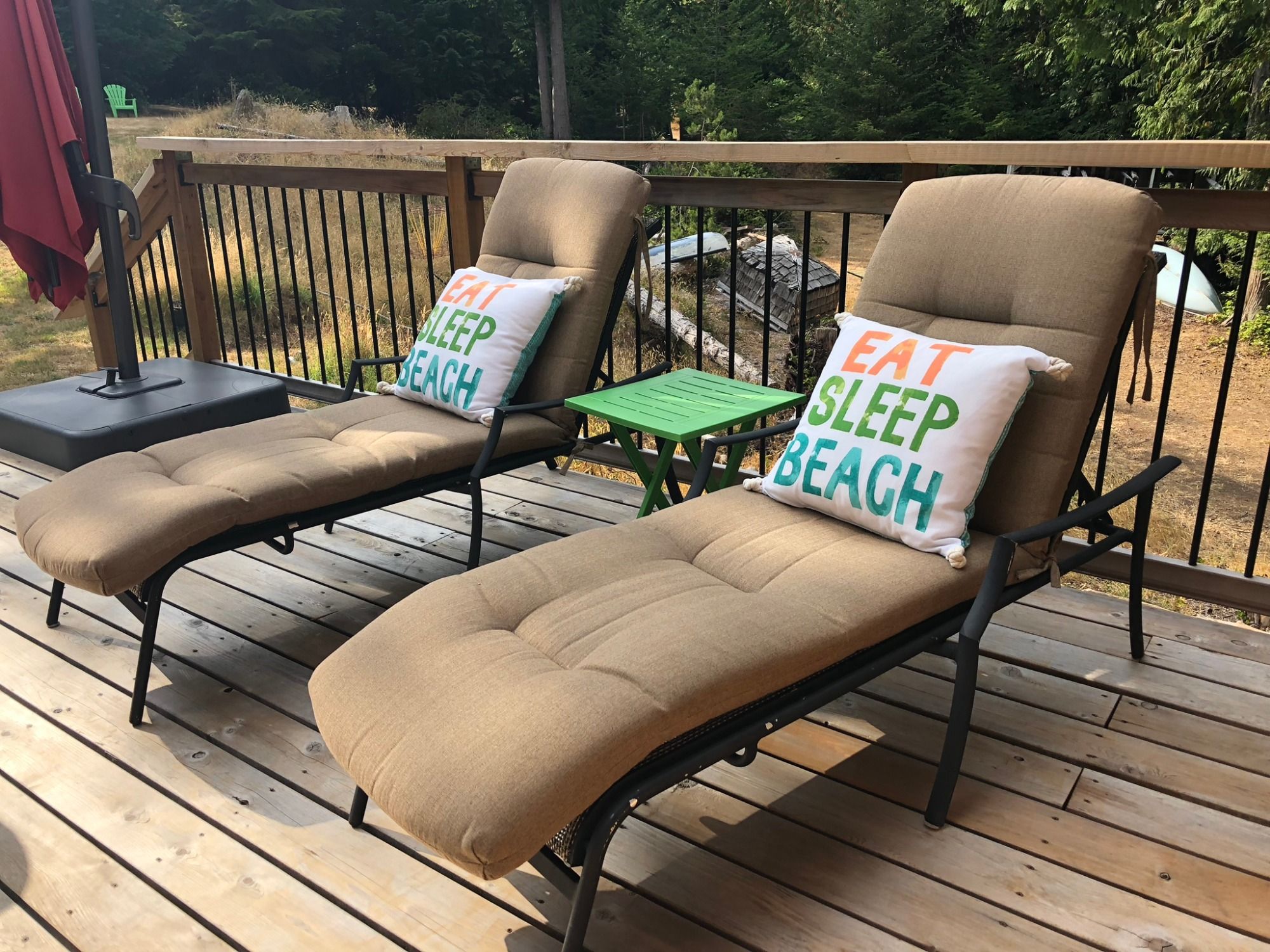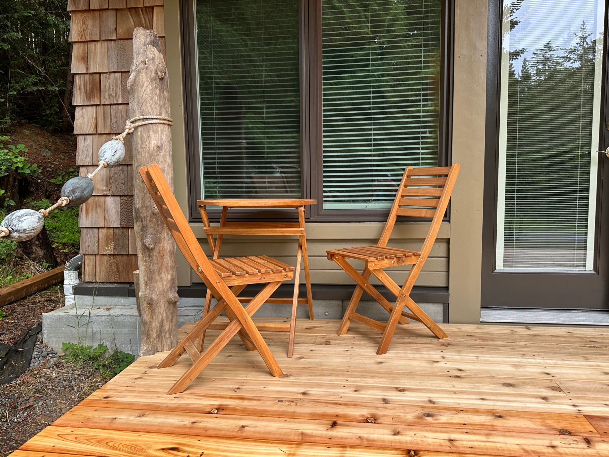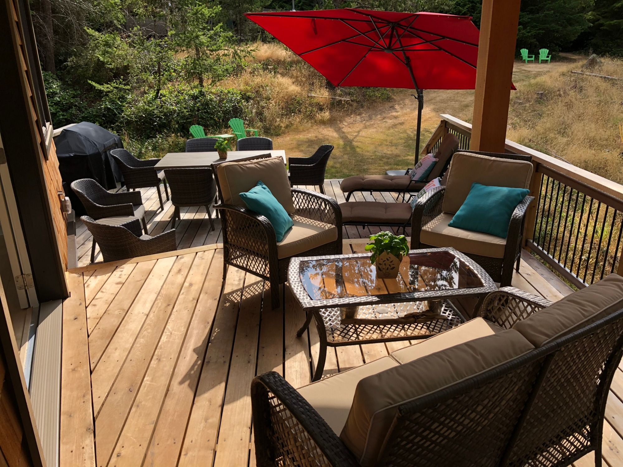 Two level upper deck with lounge seating up top. Dining table, eight chairs, two lounge chairs, and a large sun umbrella are three steps down. There is a front deck for the two bedrooms with outdoor lighting, tables, and chairs. We have a deck heater, toys, and beach chairs. There is a picnic table and a grassy area for bocci, croquet, and other game. And more shared grass beyond for soccer, badminton, or whatever you want.